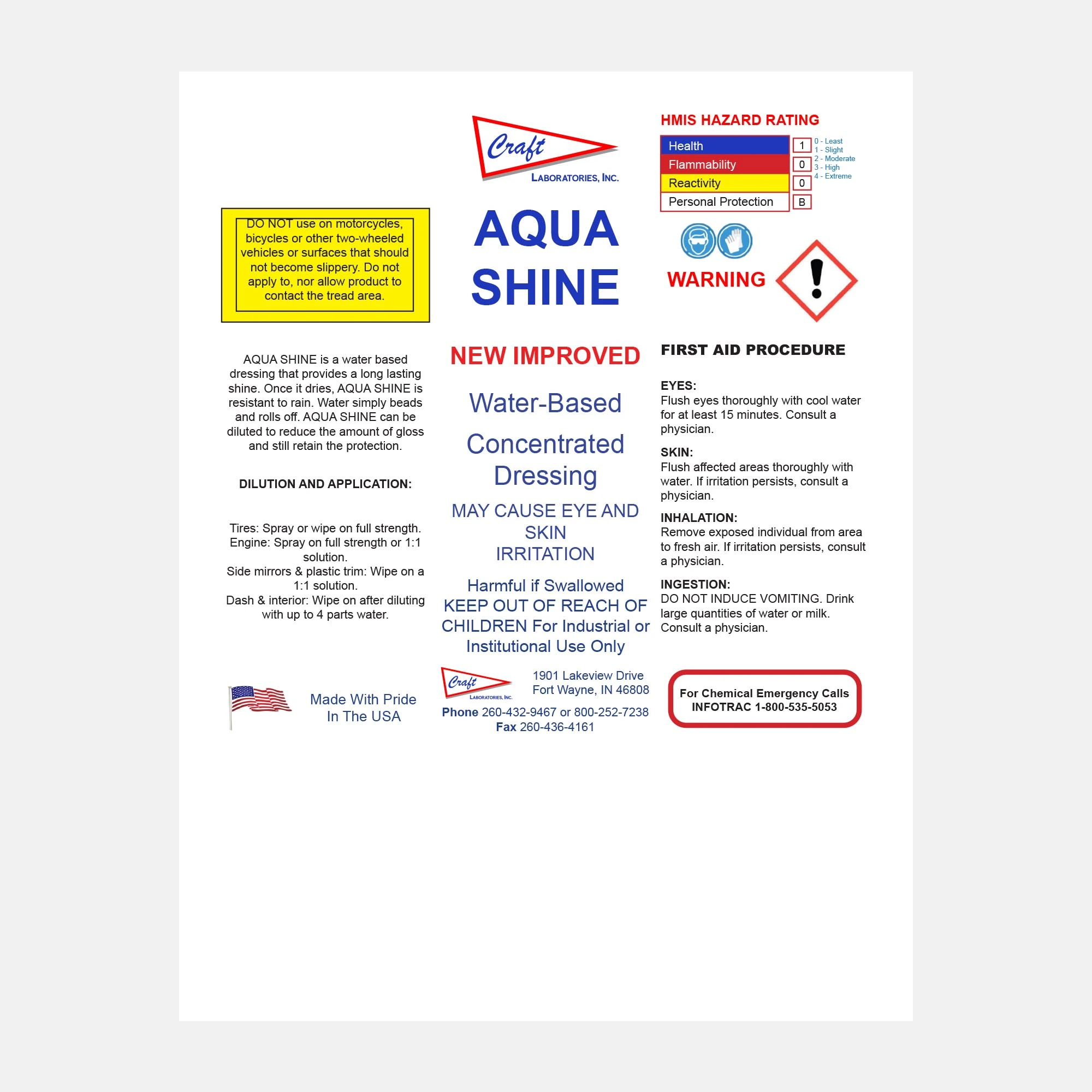 Water-Based Concentrated Dressing - Aqua Shine is a premium, water-based dressing designed to provide a brilliant, long-lasting shine on automotive surfaces. Its improved formula enhances appearance, repels water, and resists sling-off, making it ideal for detailing professionals and maintenance operations.