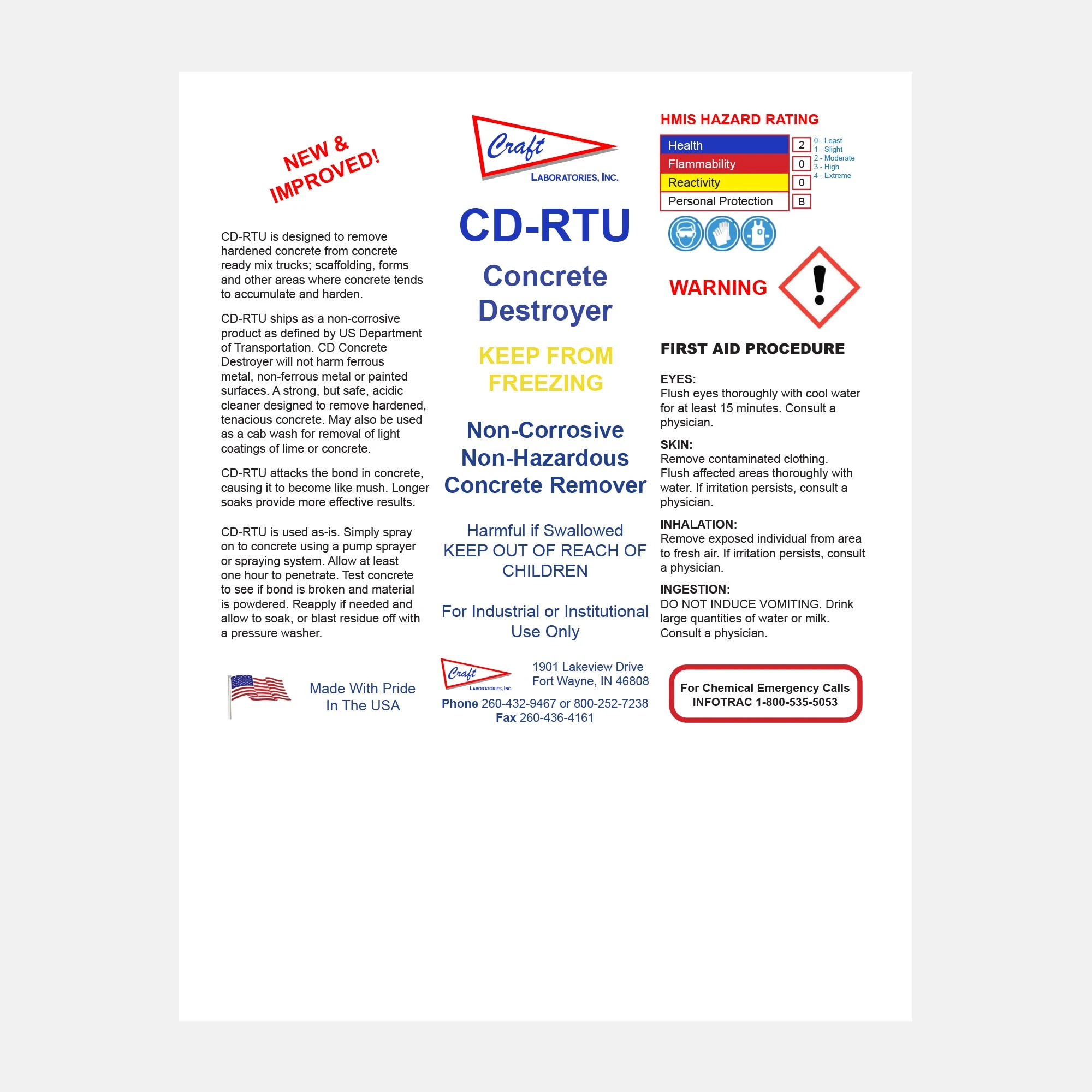 Although CD-RTU is non-corrosive and non-hazardous, avoid prolonged contact with skin or eyes. Wear standard protective gloves and eyewear during application. Store in a cool, dry place and keep from freezing.