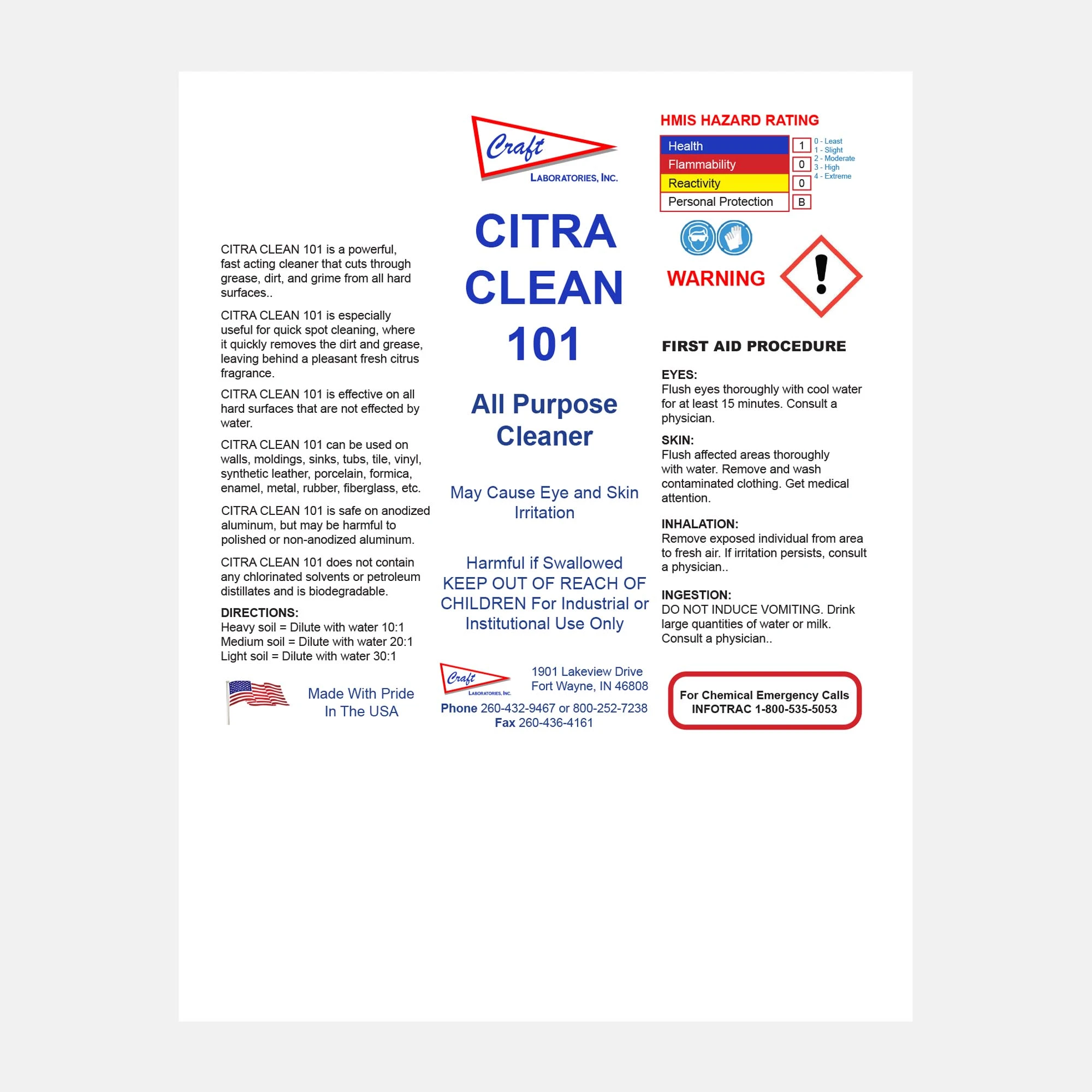 Citra Clean 101 combines powerful degreasing with natural citrus fragrance for quick, effective cleaning on a wide range of hard surfaces. It removes grease, dirt, crayon, ink, and smoke residues from tile, vinyl, porcelain, fiberglass, metal, and synthetic materials. Biodegradable and solvent-free, it’s tough on soil but safe on most finishes and anodized aluminum.