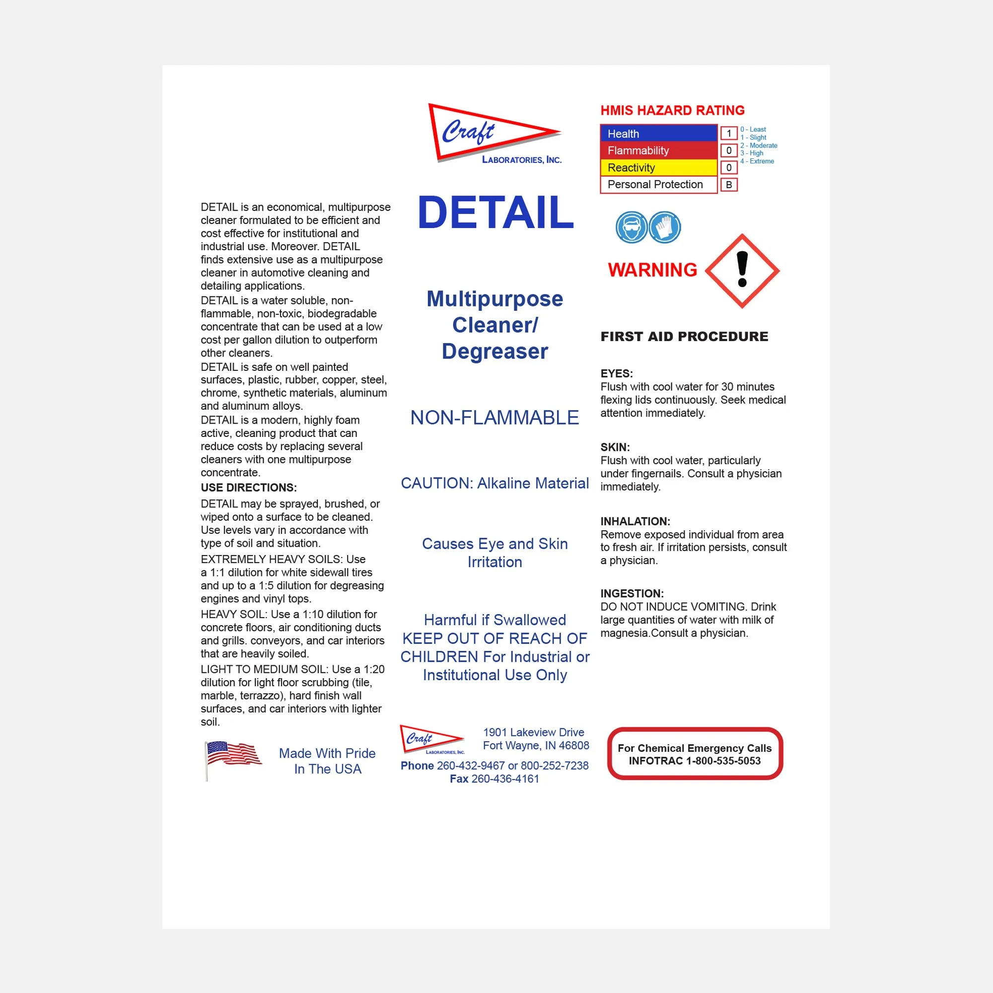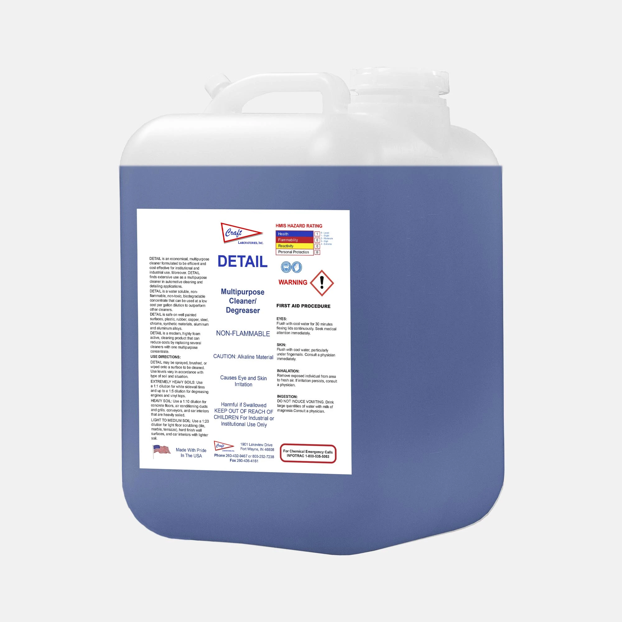 Detail is a non-flammable, biodegradable multipurpose cleaner originally developed for vehicle detailing. Highly effective on painted, plastic, and metal surfaces, it removes oil, dirt, and grease from engines, walls, floors, ducts, and even interior fabrics. Its high-foam, active formula makes it ideal for automotive, institutional, and industrial use.