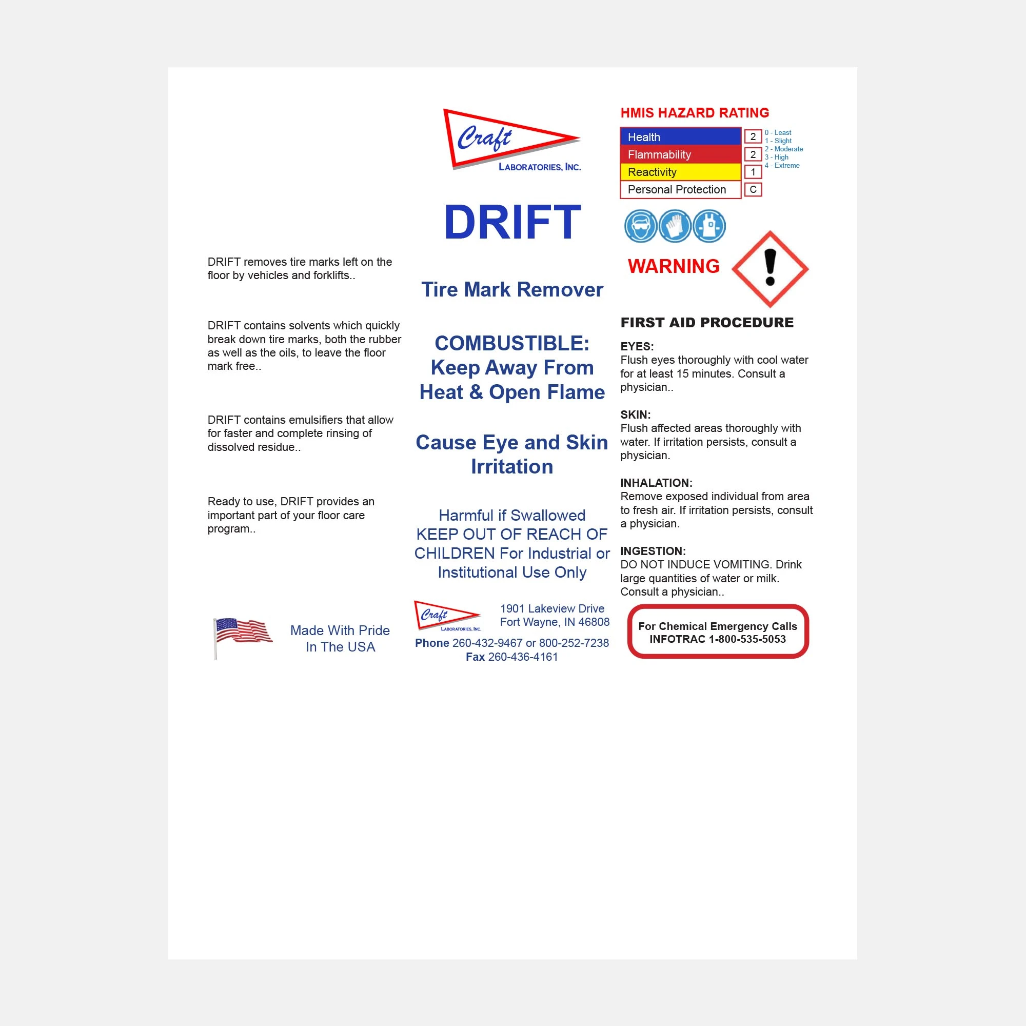 Drift is a tire mark remover formulated with solvents and emulsifiers that dissolve rubber residue and oils, leaving floors clean and safe. Designed for use in floor maintenance programs to restore heavily trafficked areas.