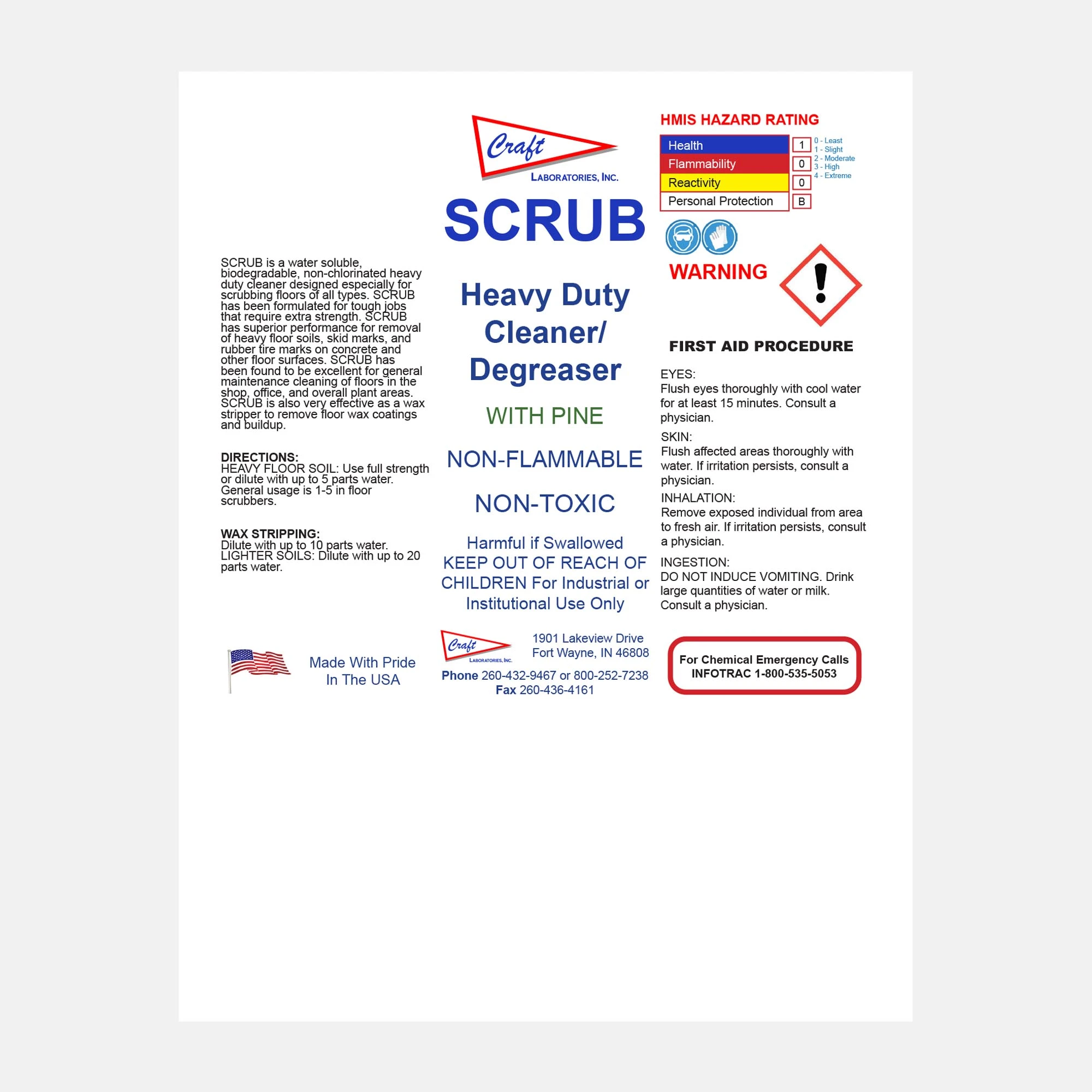 Scrub is a powerful, biodegradable cleaner and degreaser formulated to handle the heaviest soils on industrial and commercial floors. It removes grease, rubber marks, and scuffs with ease, while also working as an effective wax stripper to prep floors for refinishing. Its pine fragrance leaves behind a fresh, clean scent, making it a favorite for shops, offices, and plant facilities. Safe, non-flammable, and non-toxic, Scrub is tough on dirt but safe for routine maintenance.